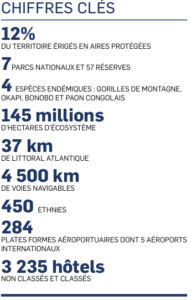 Ce formidable réservoir de faune et flore est notamment présent au sein des huit parcs nationaux et des soixante-trois réserves et domaines naturels que comptent la RDC, dont plusieurs sont inscrits à la liste des sites mondiaux en danger de l’UNESCO. La plupart de ces espaces protégés sont confrontés à de graves problèmes (braconnage, déforestation, pillage des ressources naturelles, etc.) liés aux troubles que le pays a connus ces quinze dernières années. Tout cela forme ce pays unique en bien des aspects, d’une beauté et richesse incroyables, et au potentiel, écotouristique énorme.